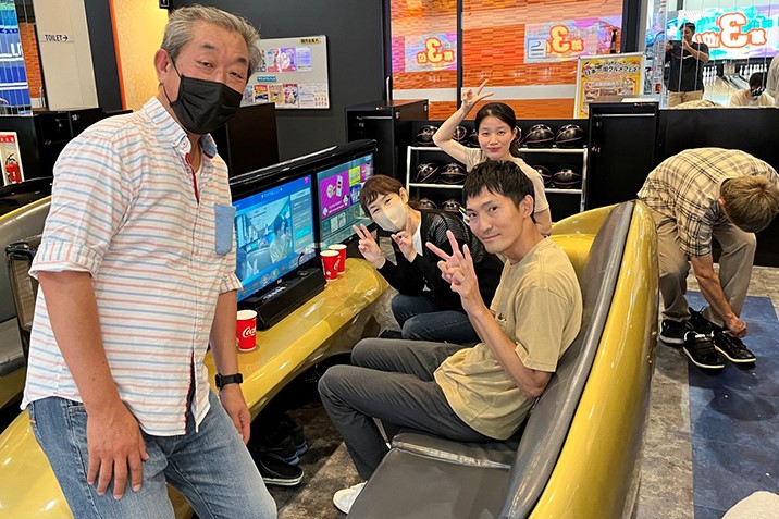 両拠点合同のボーリング大会。拠点混合でチームを組み、得点を競いました。仲良くピース! -